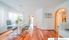 Weiter geht es zum lichtdurchfluteten Wohn-Essbereich mit edler Glastüre. Dieser bildet das Herzstück der Immobilie. Von dort aus haben Sie einen direkten Zugang zum großzügigen Ostbalkon. Hier können Sie wunderbare Sonnenstunden genießen und die Seele baumeln lassen.