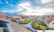 Durch das innenliegende Treppenhaus erreichen Sie das Dachgeschoss. Die 3,5- Zimmerwohnung verfügt über ca. 80,75 m² Wohnfläche. Vom Schlafzimmer und Wohnzimmer aus haben Sie einen direkten Zugang zum überdachten Balkon, dieser ist ebenfalls mit hochwertigen Holzdielen auslegt. Die geschmackvolle und helle Einbauküche mit integrierter Sitzecke lädt zu gemütlichen Kochabenden ein. Das Badezimmer ist wie im Erdgeschoss halbhoch gefliest und verfügt über hochwertiges Sanitär. Die begehbare Echtglasdusche sowie der moderne weiße Waschtisch sind ein Hingucker. Direkt angrenzend befindet sich das Gäste-WC.