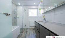 Die Einliegerwohnung zeigt sich mit 3 Zimmern, einer Einbauküche in schöner Holzoptik und einem Badezimmer mit Fenster, Dusche, Waschtisch und WC. Zusätzlich bietet sie ein Schlafzimmer, Wohnzimmer und ein weiteres kleines Zimmer mit Teppichboden. Auf dieser Ebene befinden sich auch eine Waschküche sowie der Heizraum/Technikraum.