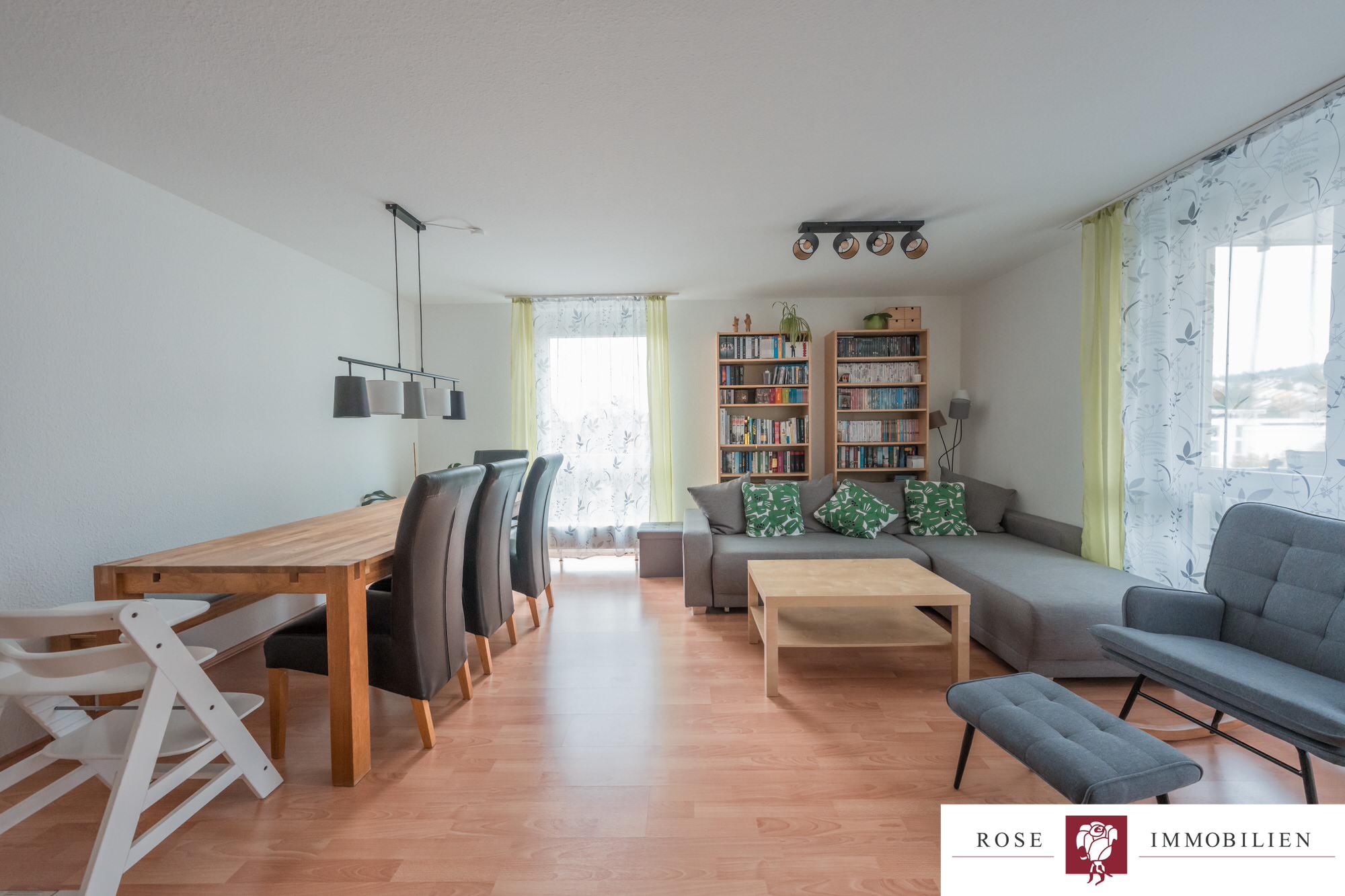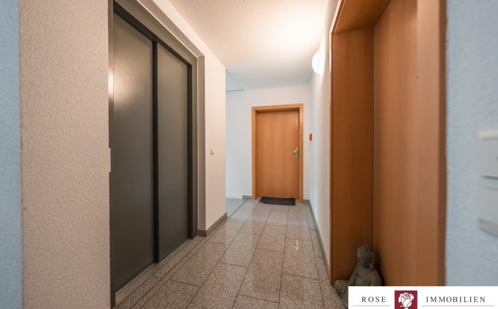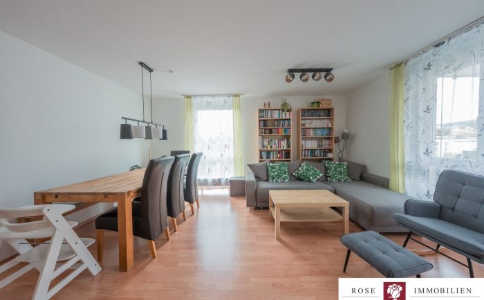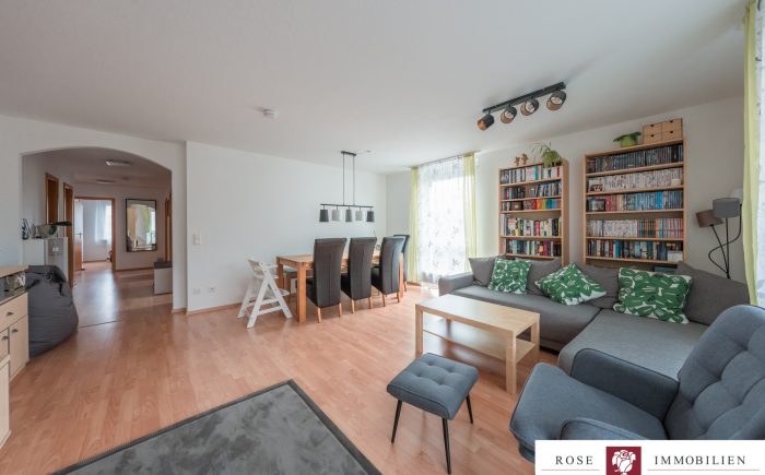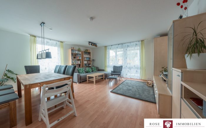 Die Wohnung liegt in einem Mehrfamilienhaus mit Aufzug und ist barrierefrei zugänglich. Der großzügige Wohn- und Essbereich bildet das Herzstück der Wohnung. Durch die großen Fensterflächen gelangt viel Tageslicht in den Raum, was eine angenehme Wohnatmosphäre schafft. Vom Wohnzimmer aus haben Sie Zugang zum überdachten Südbalkon, der ausreichend Platz bietet.