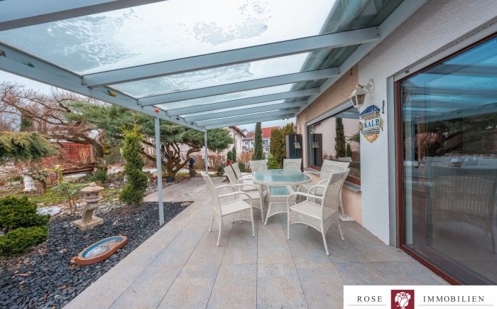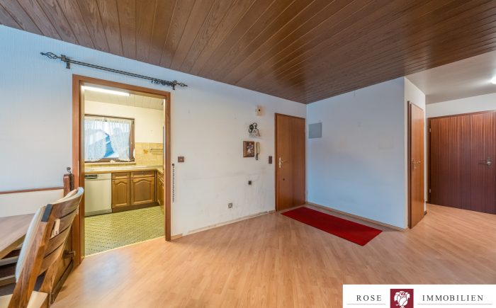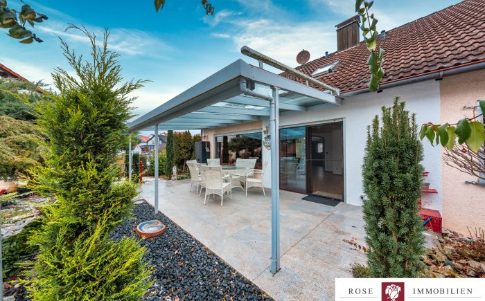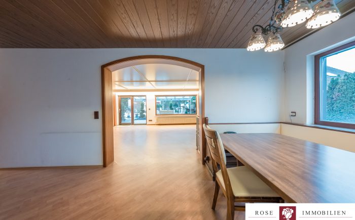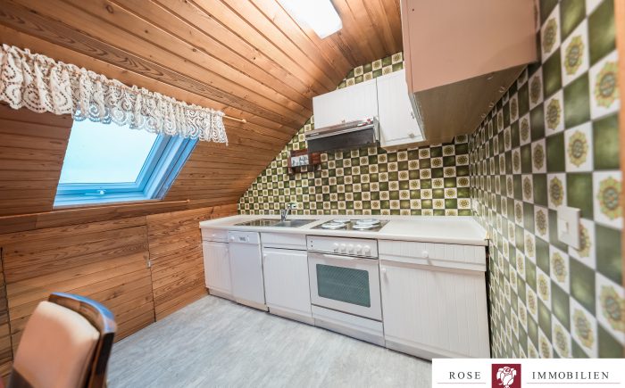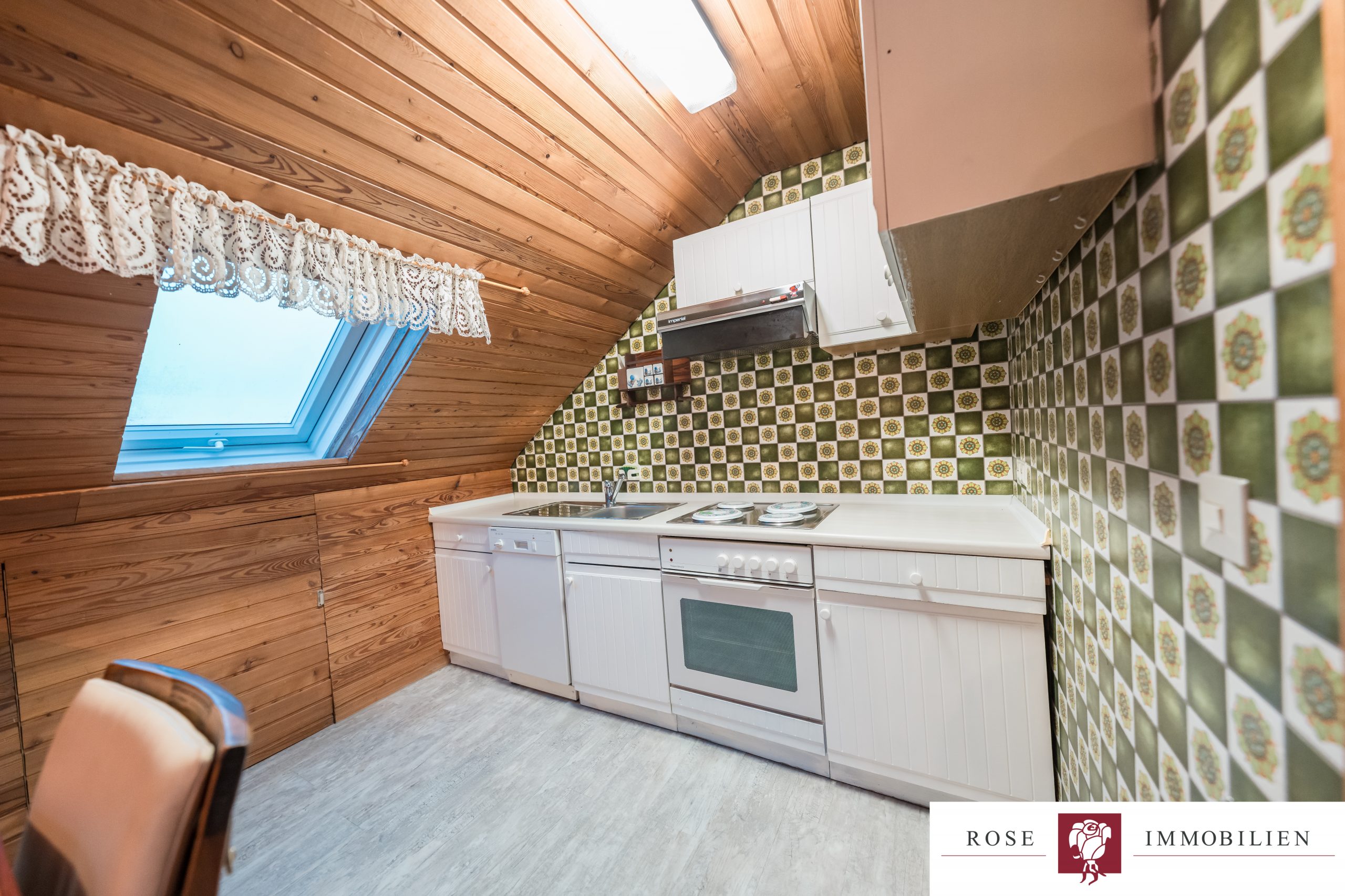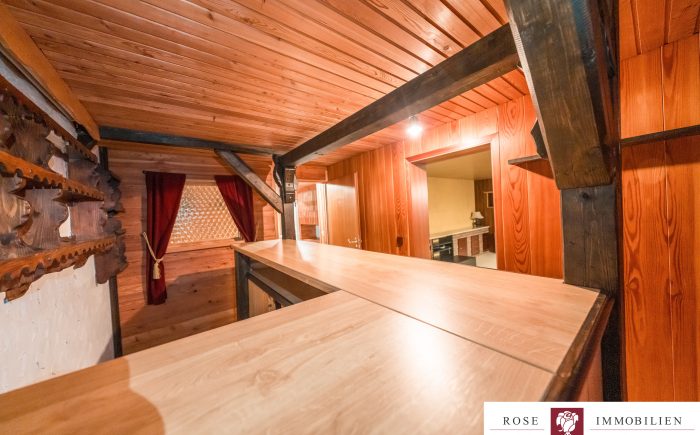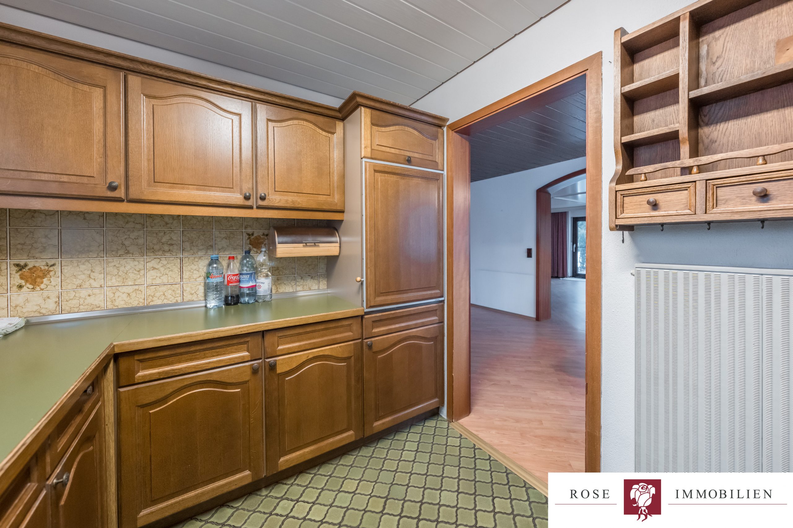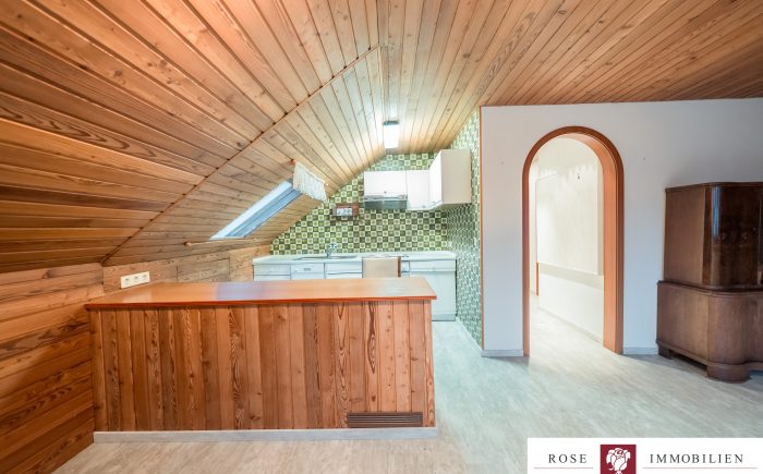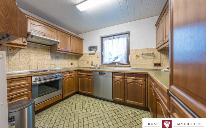 Die Einbauküche im EG aus dem Baujahr könnte auch zu einem offenen Wohnkonzept umgebaut werden. Der großzügige und offen Wohnbereich hat einen direkten Zugang zu der überdachten Terrasse und bietet über die Spindeltreppe den direkten Weg ins Kaminzimmer. Der liebevoll angelegte Garten lässt Ihnen Raum für eine Vielzahl von Freizeitaktivitäten.