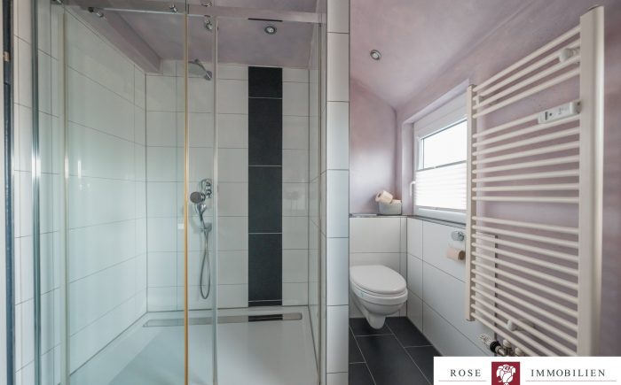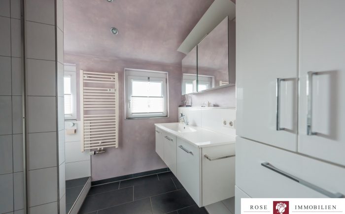 Das modernisierte Badezimmer präsentiert sich zeitgemäß mit großer, bodentiefer Dusche inklusive Hand- und Kopfbrause, großem Waschbecken, Einbauspots sowie Handtuchheizung – ein stimmiges Gesamtbild für komfortablen Alltag. Hier verbinden sich modernes Design und praktische Details zu einem angenehm gepflegten Eindruck.