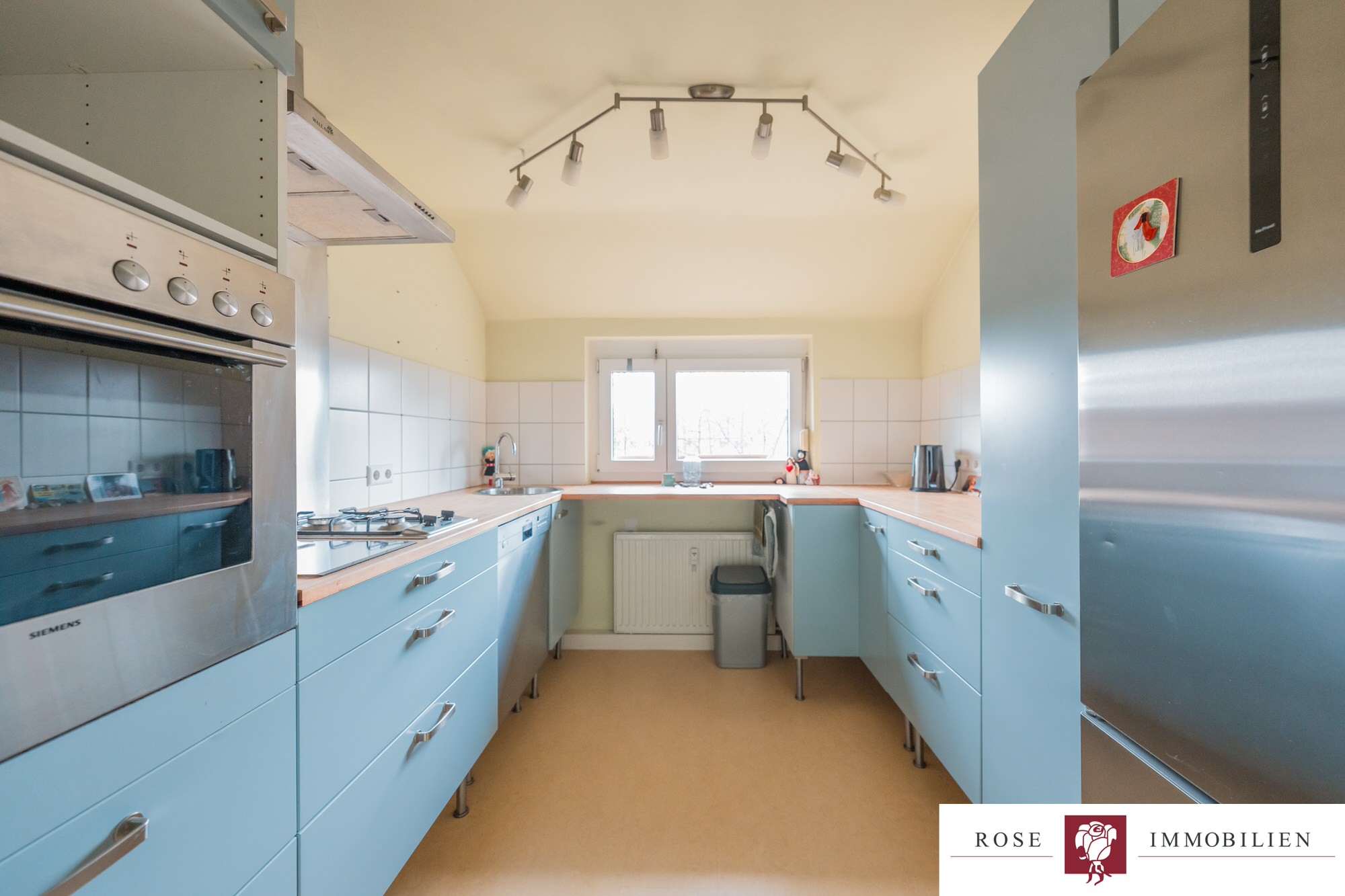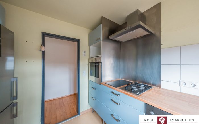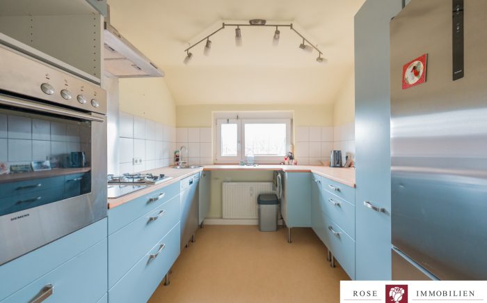 Die Einbauküche ist bereits vorhanden und überzeugt mit einer praktischen Ausstattung inklusive Ceran- und Gaskochfeld – funktional und ideal für alle, die gerne kochen. Kurze Wege und eine gute Anordnung der Arbeitsflächen machen den Küchenbereich alltagstauglich und effizient. Die Wohnung verfügt über ein Schlafzimmer und ein Studio im Dachspitz. Auch für das Thema Homeoffice bietet der Grundriss somit sehr gute Voraussetzungen.