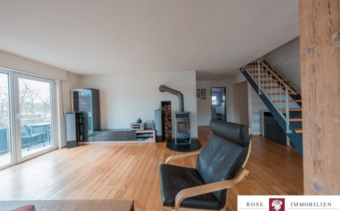 Das Herzstück ist der helle und großzügige Wohn- und Essbereich, der durch freiliegende Balken und hochwertige Kastanienholzdielen ein wohnliches Flair erhält. Der Specksteinofen im Wohnraum setzt nicht nur optische Akzente, sondern verschafft Ihnen eine besonders angenehme Wärme und dient als weitere Heizmöglichkeit. Der Balkon erweitert den Wohnraum ins Freie und bietet einen angenehmen Rückzugsort für entspannte Momente – ob zum Frühstück an der frischen Luft oder zum ruhigen Feierabend mit Sonnenuntergang.